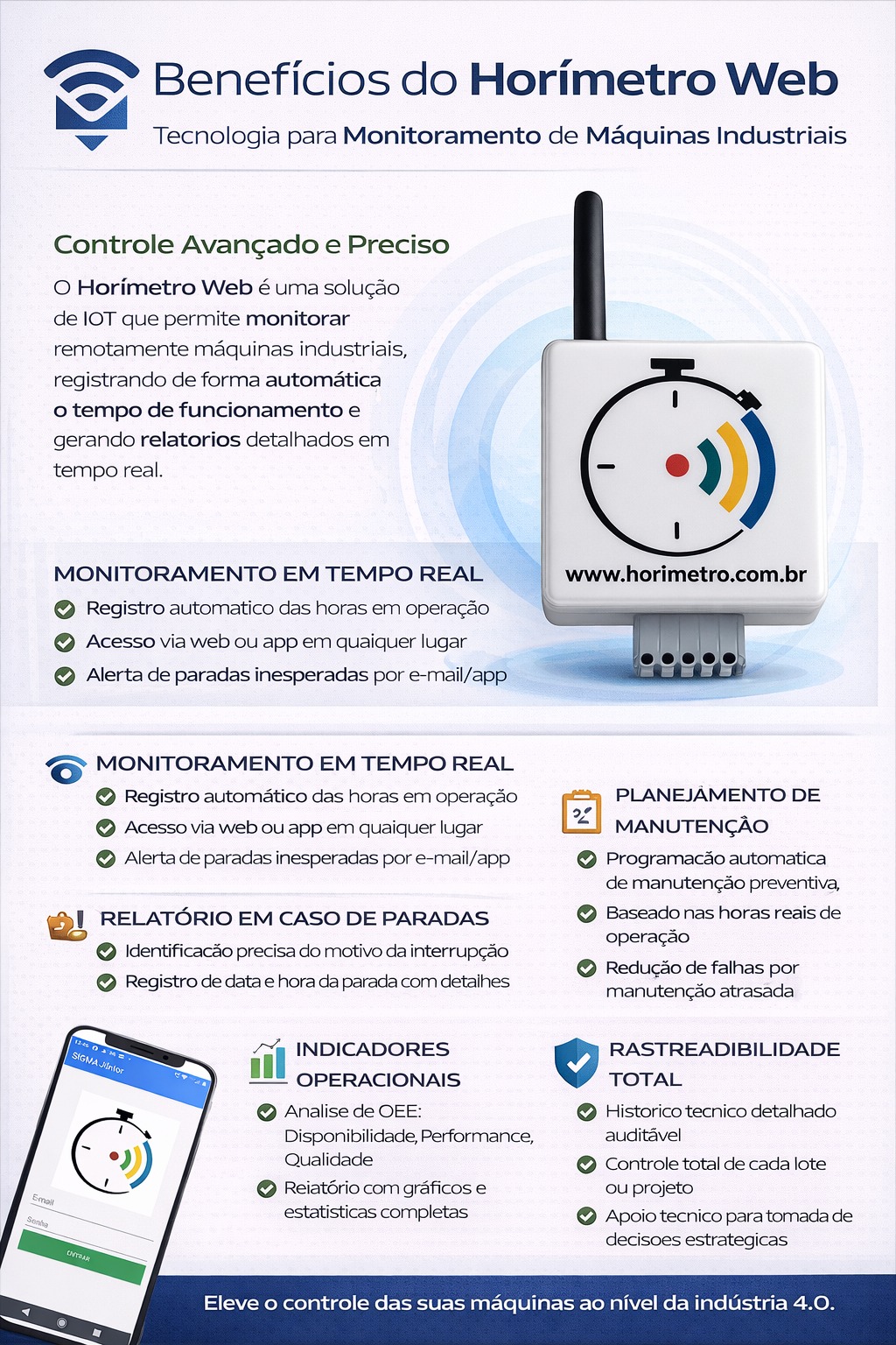 O Horímetro Wi-Fi é um equipamento eletrônico que controla as horas de acesso ou o tempo de funcionamento.